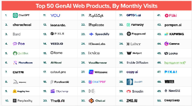 美国知名的私人风险投资公司a16z,基于SimilarWeb的流量数据(截至2023年6月),对现在市场上访问量前50名的GenAI网络产品进行了排名。